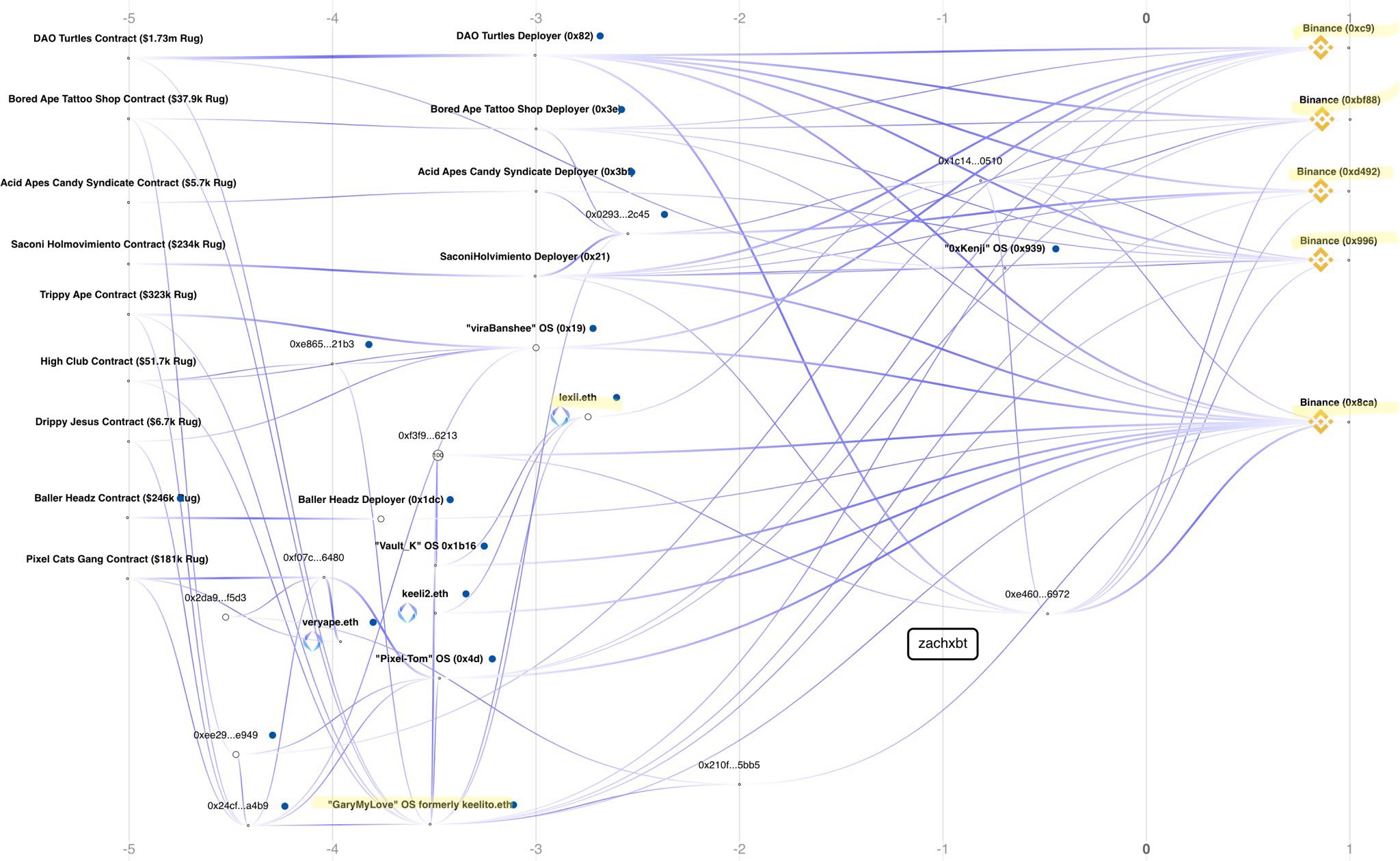 Aquí algunos de los hilos en los que @zachXBT usa Etherscan (y otros exploradores de cadenas de bloques similares) para trazar la conexión entre monederos que han perpetuado presuntas estafas: