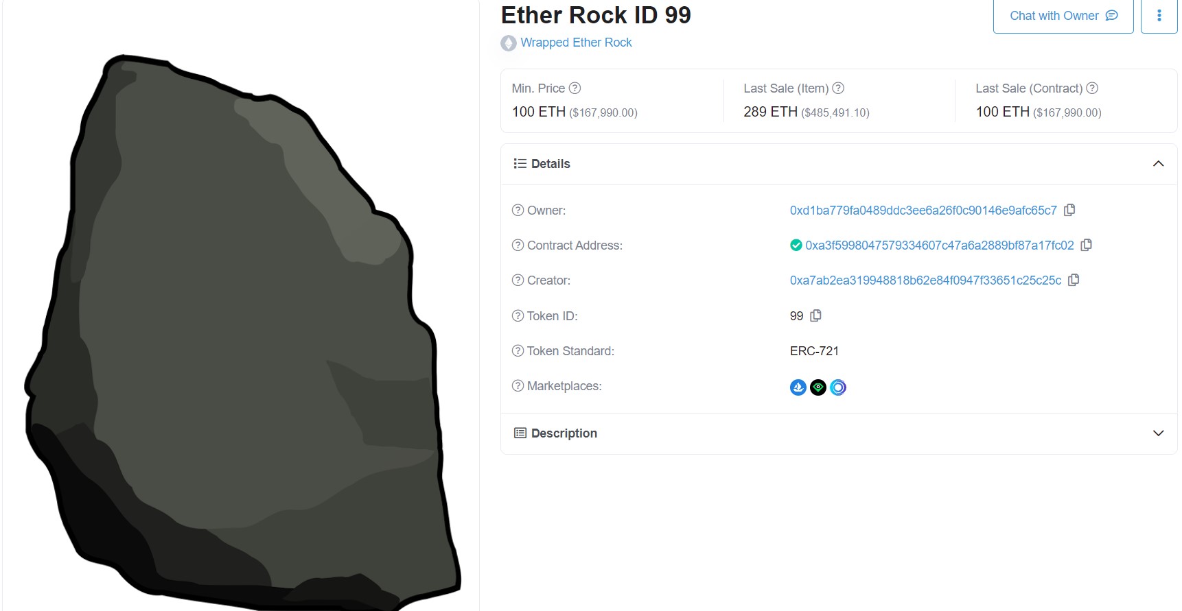 - Y ahora también se pueden visualizar los NFTs (en la siguiente imagen vemos la Ether Rock ID 99) y chatear con otras direcciones en Ethereum.