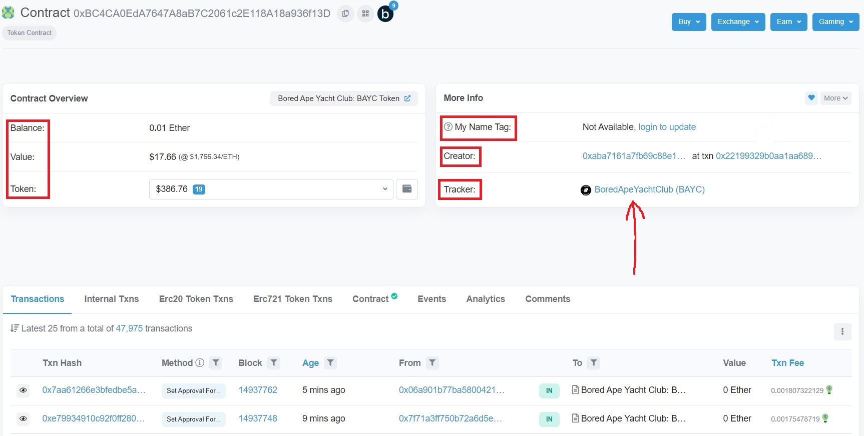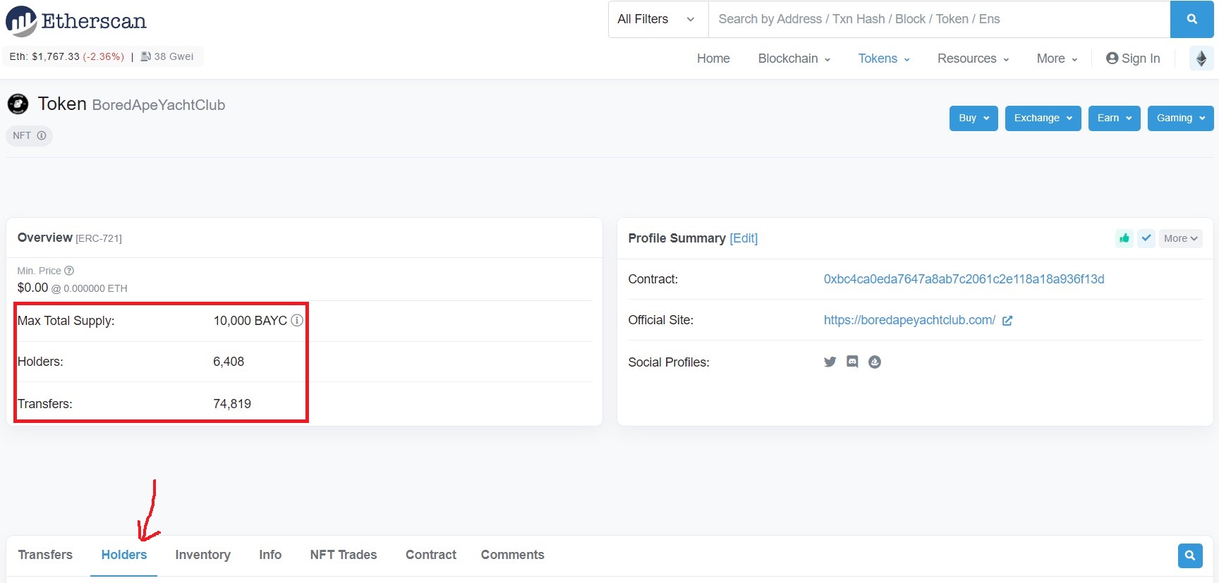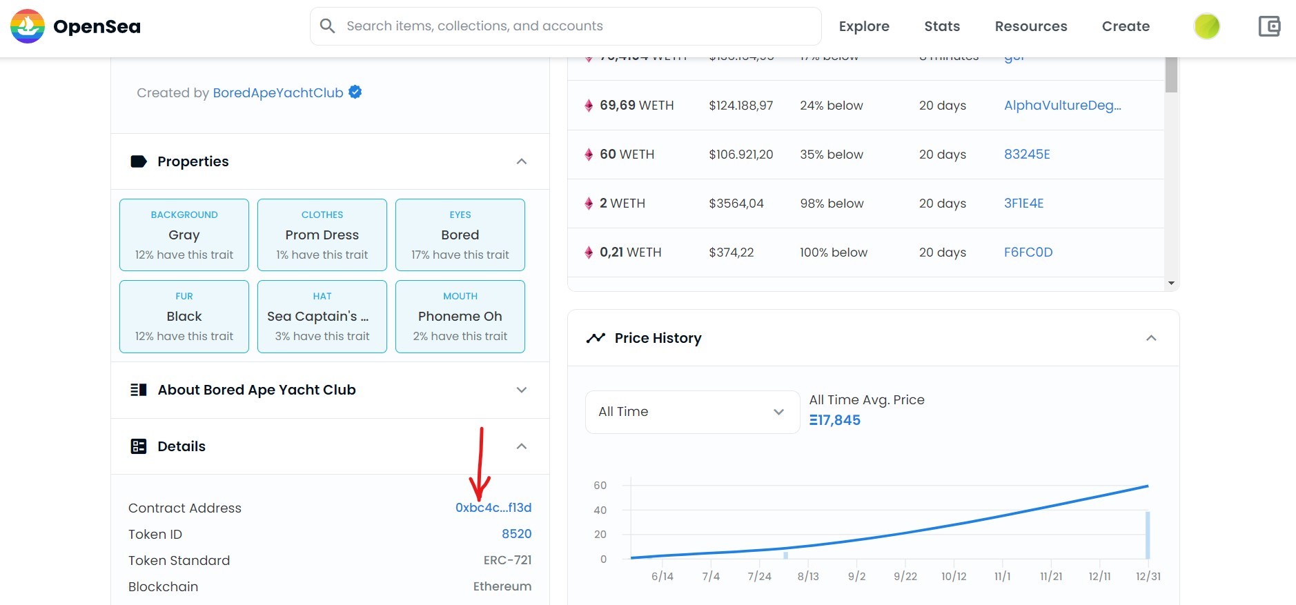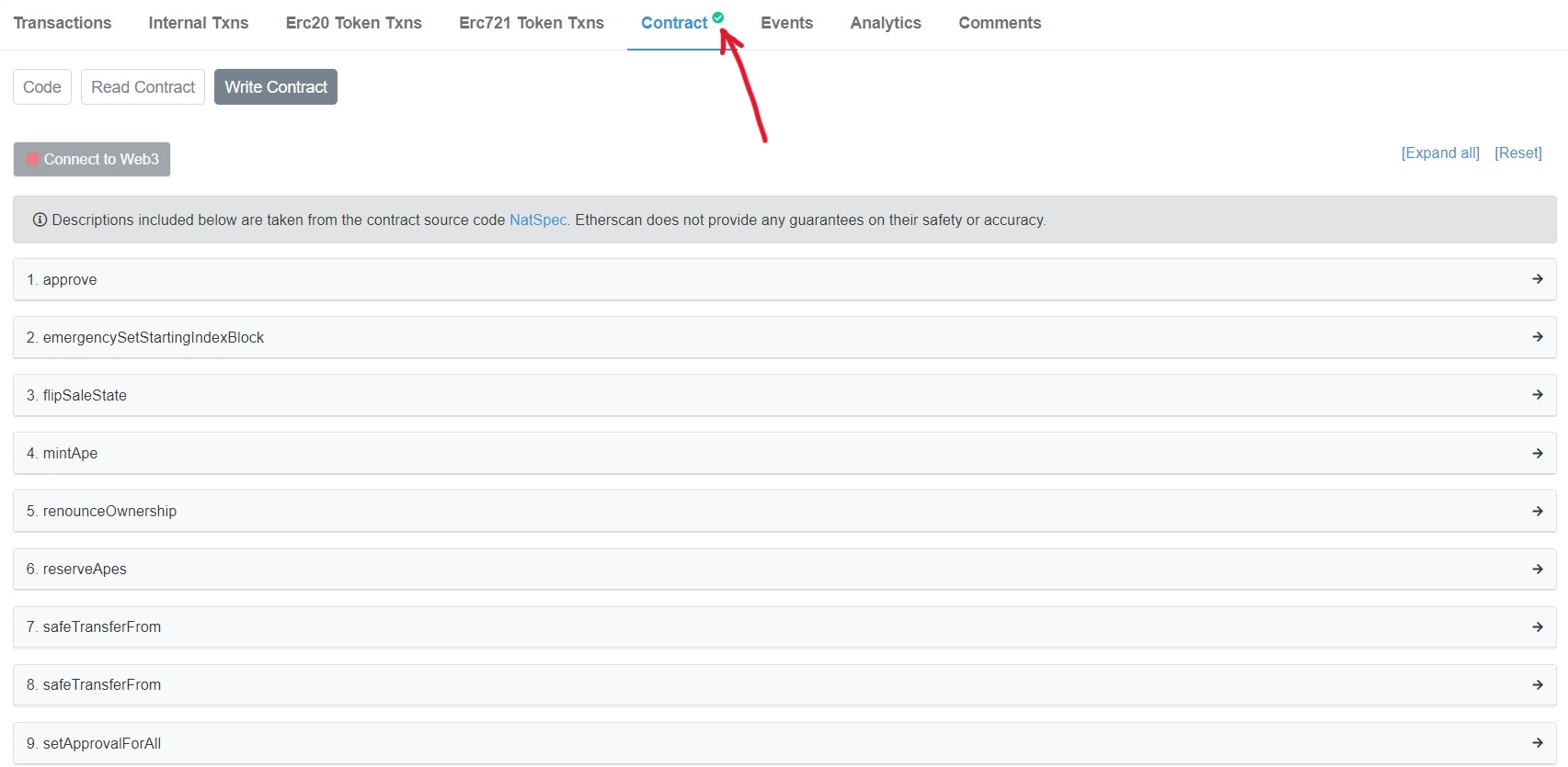 - Vamos a Opensea y buscamos el contrato de BAYC. Si hacemos click, directamente (señalado por la felcha roja en la imagen siguiente) nos redirige a Etherscan.