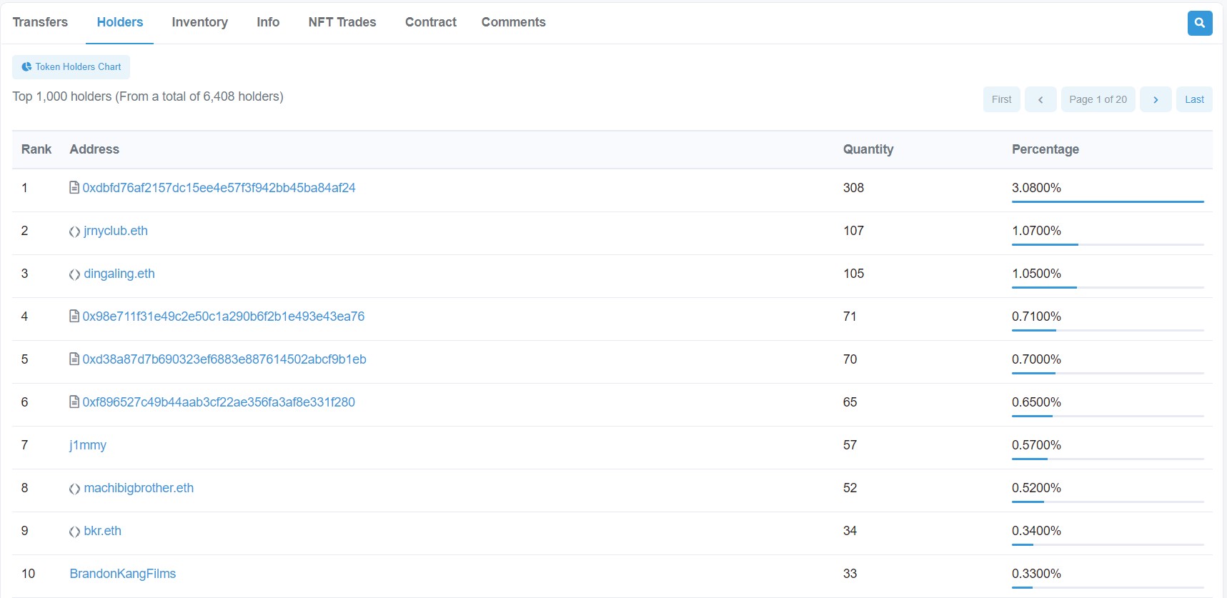 - Seguimiento de monederos: se puede ver qué tokens ERC-20 y NFTs (ERC-721) tiene un monedero. También podemos ver cuándo, con quién y cómo interactúa un monedero con contratos inteligentes u otros monederos. Esto también nos permite seguir los pasos de forma retroactiva para ver de dónde proceden los fondos de un monedero o contrato inteligente.