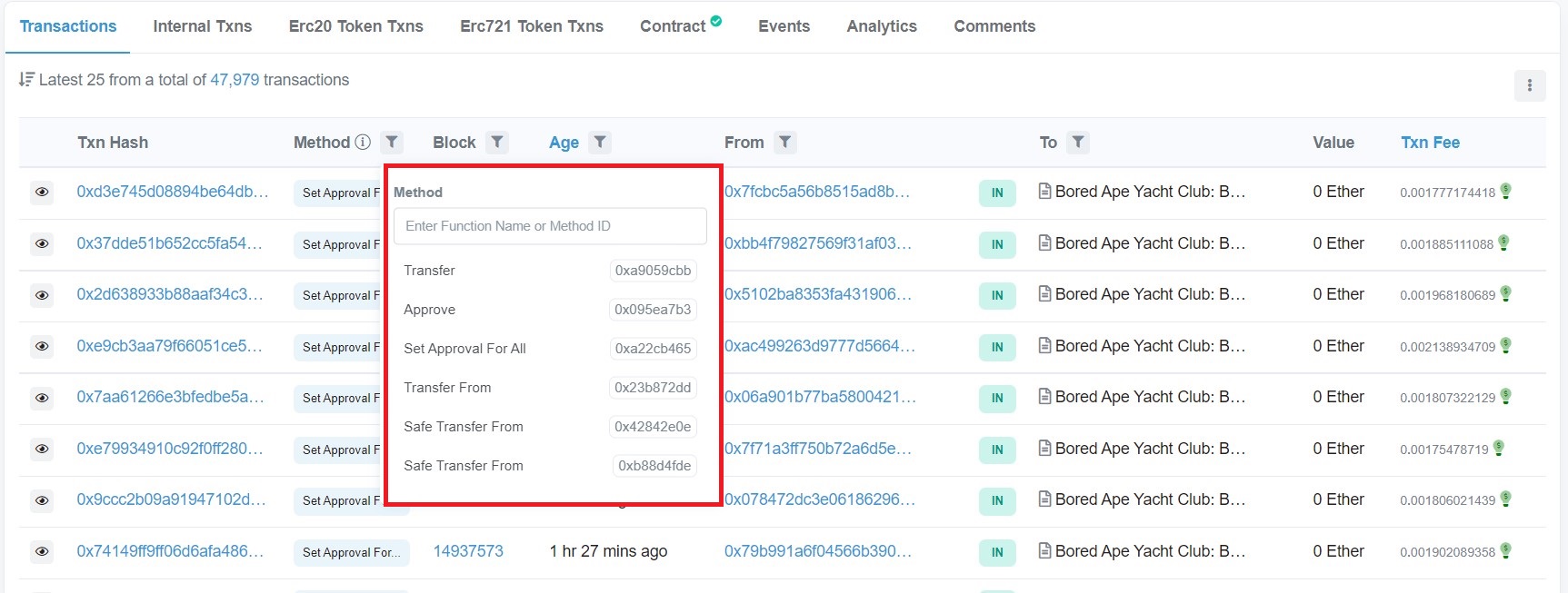 - Si volvemos a la página principal del contrato en Etherscan, en la parte de las transacciones podemos utilizar los filtros para seleccionar el método (funciones ejecutadas por el contrato). Las funciones más comunes son las de “approval”, “mint” y “transfer”.