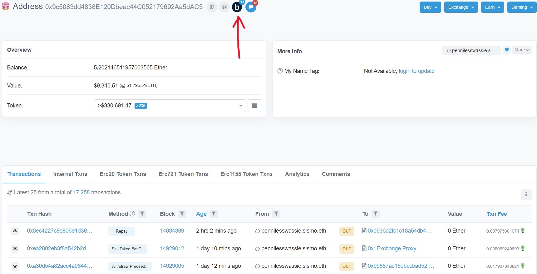 - Esto nos abre la página de esta dirección y también nos permite ver una lista de todas sus transacciones.