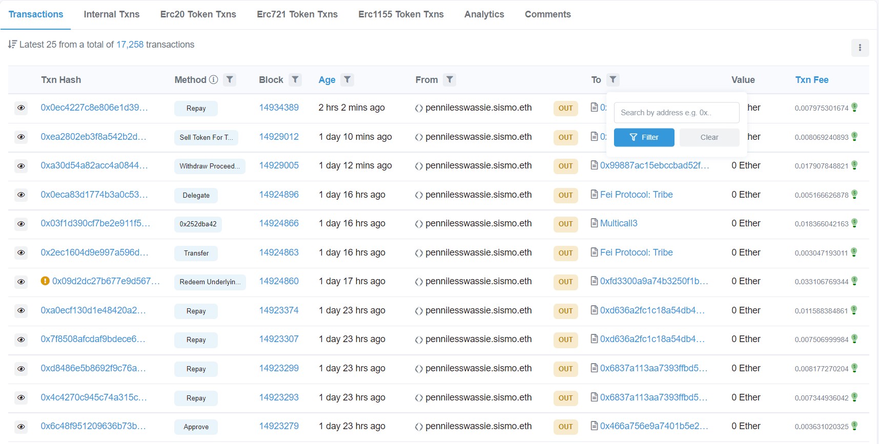 - Etherscan nos permite filtrar las transacciones de una dirección por varios conceptos (fecha, número de bloque, dirección de destino/origen o función del contrato inteligente).