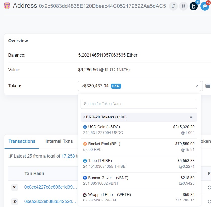 - Si desplegamos la pestaña de “Token”, podemos ver todos los que esta dirección tiene en este momento en el monedero: $245k en USDC, $80k en RPL, $5.5k en TRIBE, etc., además de decenas de tokens (muchos de ellos son estafas) que envían a monederos famosos para intentar simular credibilidad del proyecto. Además, también hay 5.2 ETH.