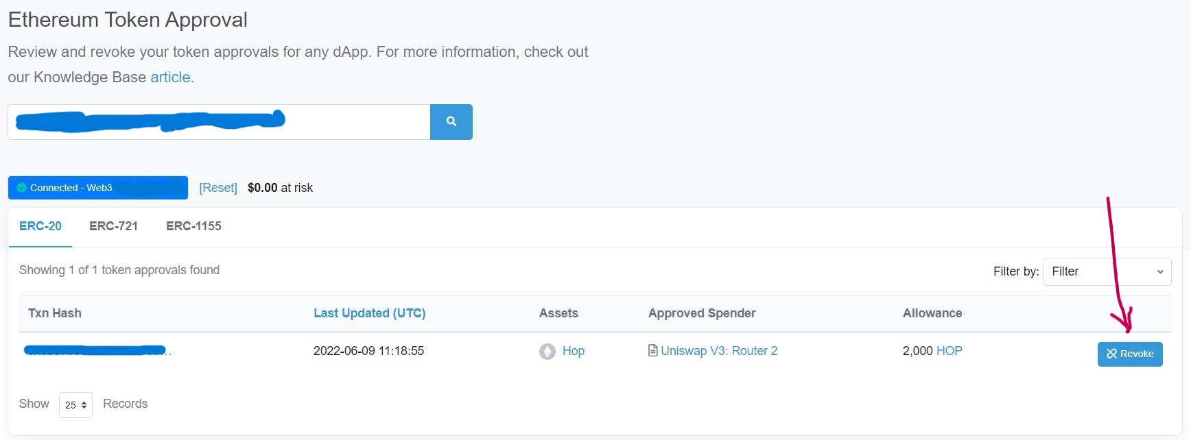 - Nos aparece una lista con el token, quién tiene permiso para gastarlo (approved spender) y la cantidad que puede gastar de nuestro monedero (allowance). Si le damos al botón de “Revoke” (señalado en la siguiente imagen con una flecha), nos saldrá el pop-up de nuestro monedero para firmar la transacción que revocará el permiso para gastar ese token de nuestro monedero (o podremos reducir la cantidad máxima que puede gastar).