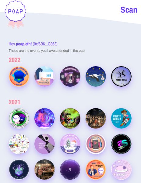 El conjunto de SBTs que contiene un alma puede usarse para formar una identidad en la web3. En la imagen siguiente vemos una colección de POAPs (estos no son SBTs ya que pueden ser transferidos a otras cuentas) asociados a la cuenta de un usuario que muestran las conferencias y eventos en los que ha participado.