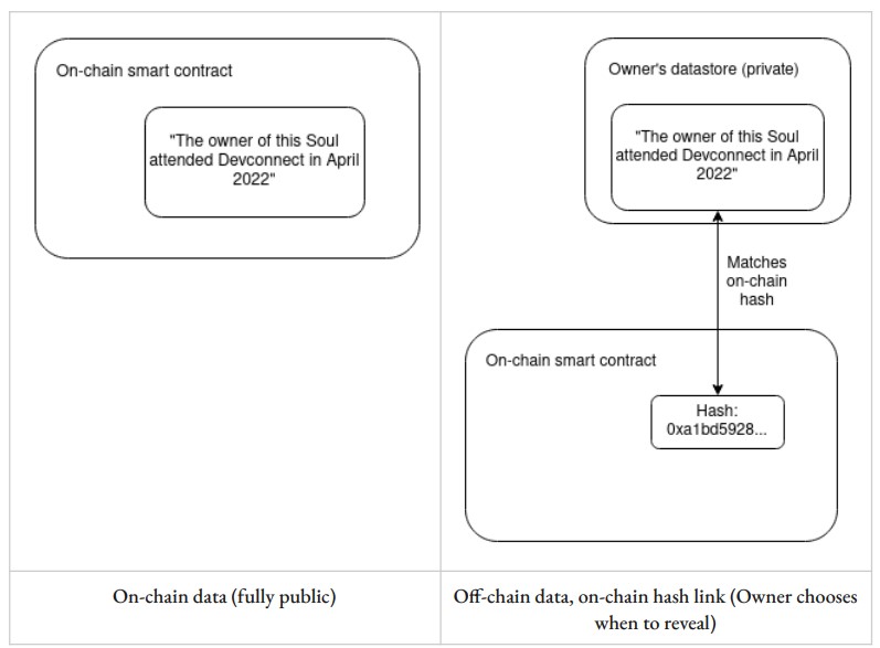 Las almas son cuentas que contienen tokens SBT públicos, visibles y no-transferibles y que pueden ser acuñados y rechazados por el distribuidor. Según explican los co-autores del paper, este conjunto de características no se ha escogido porque sean las más convenientes, sino porque son las más fáciles de implementar actualmente, a la vez que aportan funcionalidades significativas. El hecho que, inicialmente, los SBT sean públicos y visibles hace que sea más fácil para validar como prueba de concepto. El siguiente paso será desarrollar SBTs privados.