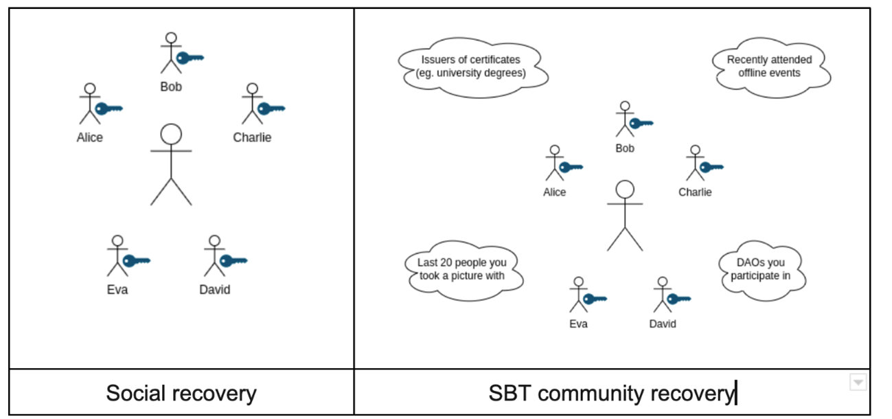 Una solución más robusta es ligar la recuperación del alma a la pertenencia a varias comunidades. Algunas de estas comunidades podrían ser fuera de la cadena de bloques (empleo, clubes, universidad, congregación religiosa) mientras que otras pueden estar más relacionadas con la cadena de bloques (gobernanza de un protocolo o una DAO). En este modelo, recuperar las claves privadas de un alma requiere el consentimiento de un miembro de una mayoría cualificada (de un subgrupo aleatorio) de una de las comunidades del alma. En la siguiente imagen vemos una comparación entre ambos modelos.